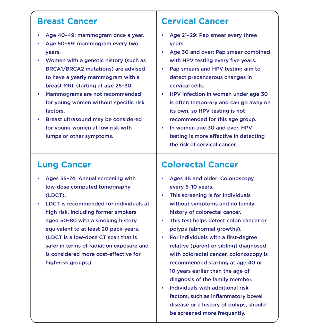 Screenings such as mammograms, Pap smears, colonoscopies, prostate-specific antigen (PSA) tests, and low-dose CT scans can detect cancer before it causes symptoms.