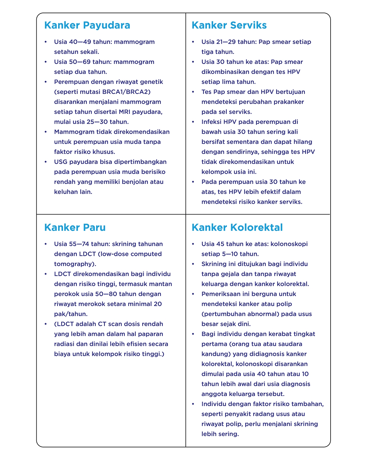 Skrining seperti mammogram, Pap smear, kolonoskopi, tes antigen spesifik prostat (PSA), dan CT scan dosis rendah dapat mendeteksi kanker sebelum gejala muncul.