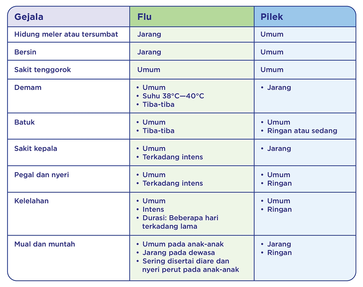 Tabel di bawah ini membantu Anda membedakan gejala pilek dan flu. Perlu diingat bahwa gejala dan tingkat keparahannya dapat bervariasi sesuai usia dan kondisi kesehatan.