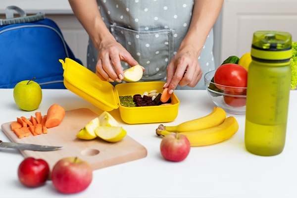 Pilihan yang baik meliputi telur rebus, yogurt, granola batang, serela kering, buah segar atau kering. Jangan lupa untuk menyelipkan sayuran hijau ke dalam salah satu makanan.