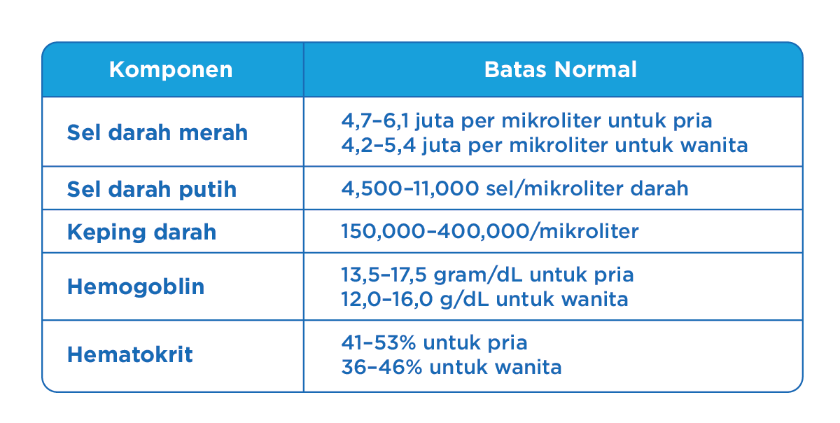 Pemeriksaan meliputi cek hemoglobin (Hb), hematokrit (Ht), trombosit, sel darah putih (leukosit), sel darah merah (eritrosit), dan gula darah.