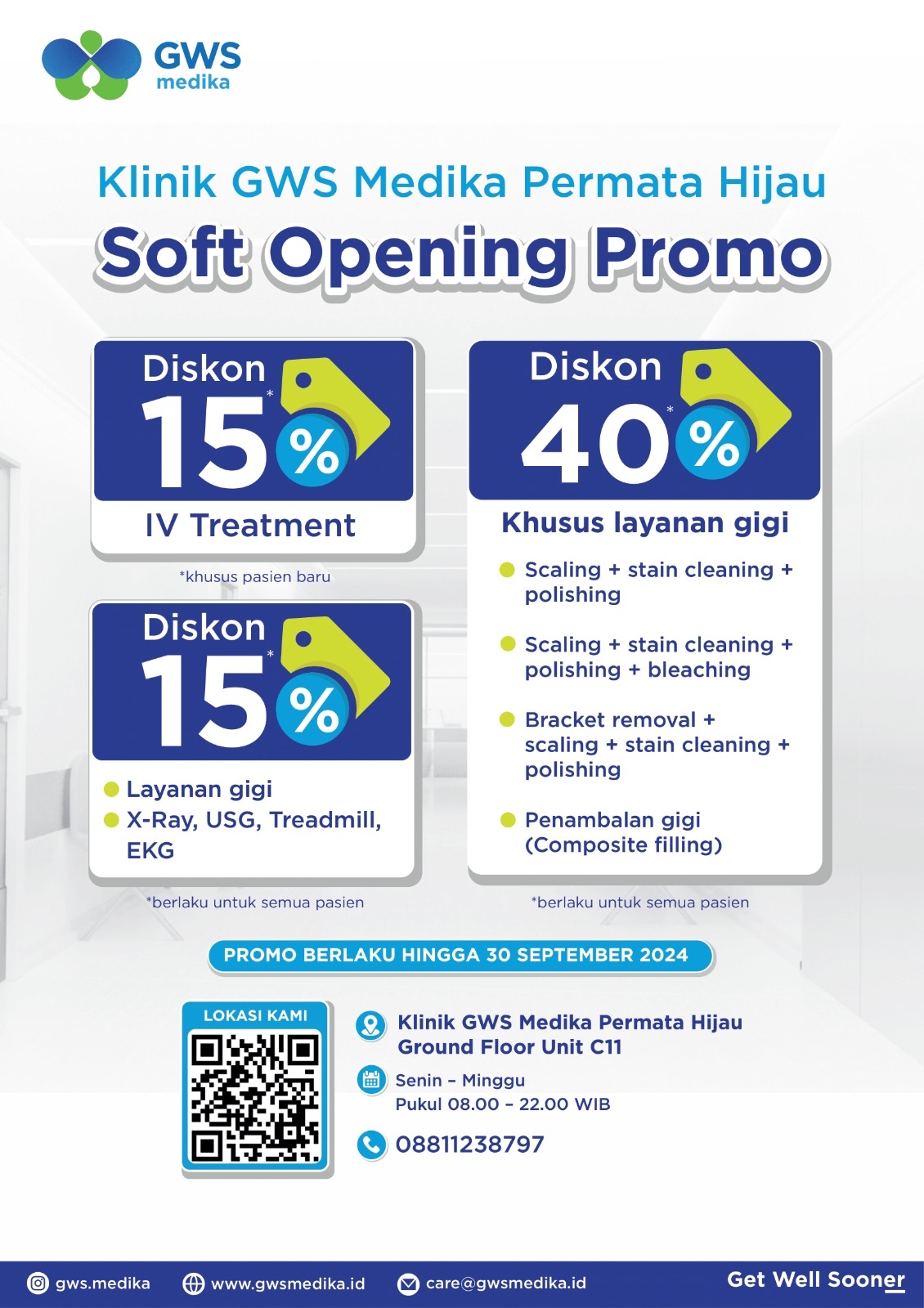 Kabar gembira untuk Anda! Klinik GWS Medika Permata Hijau memberikan diskon hingga 40% untuk layanan gigi dan suntik vitamin.