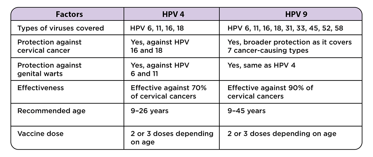 The HPV vaccine is given to all girls aged 9–14 before they become sexually active. There are two types of vaccines available: HPV 4 and HPV 9.