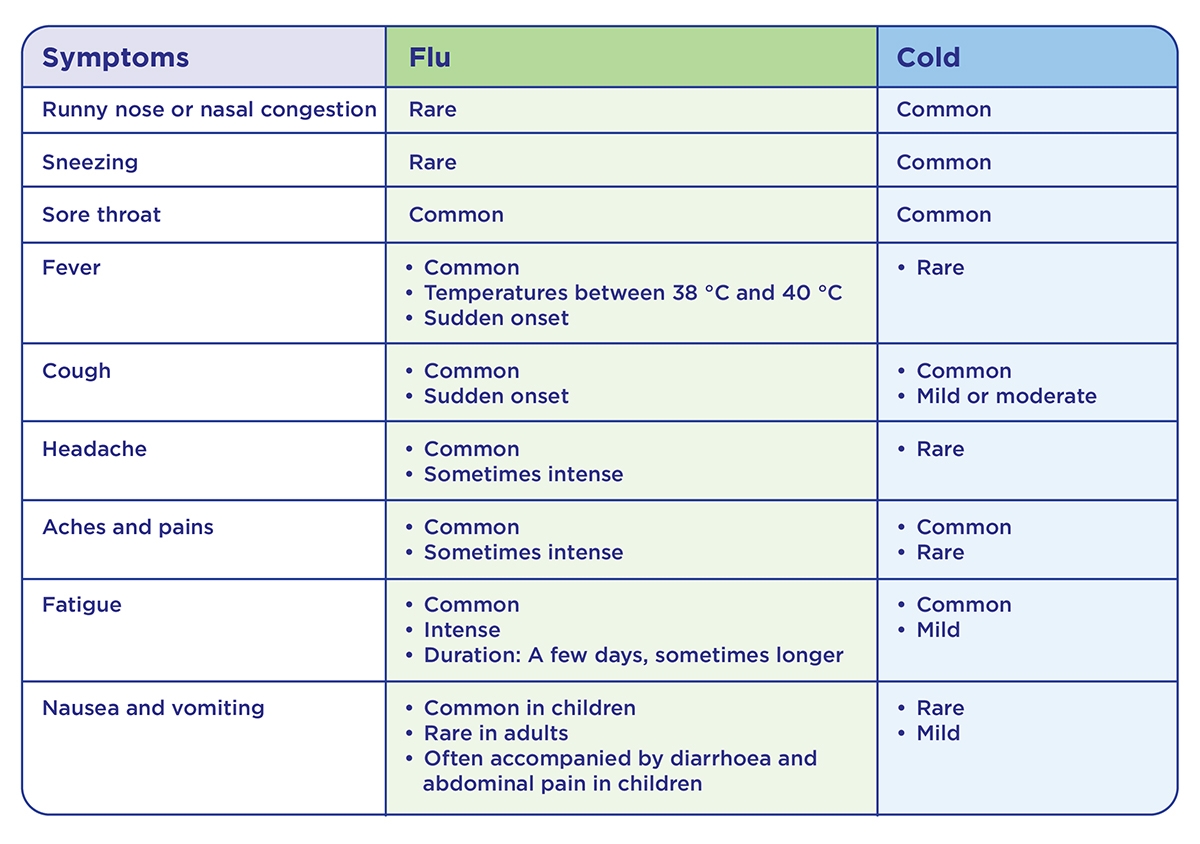 The table below helps you distinguish between cold and flu symptoms. Keep in mind that symptoms and their severity can vary with age and health conditions.