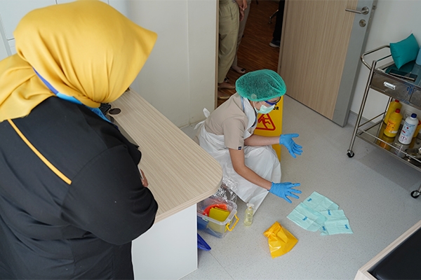 Tak hanya diskusi dan tanya jawab, tim surveyor juga melakukan survei langsung ke klinik. Dalam survei ini, tim surveyor meminta salah satu tim klinik untuk melakukan praktek langsung bila ada kejadian tumpahan bahan berbahaya.